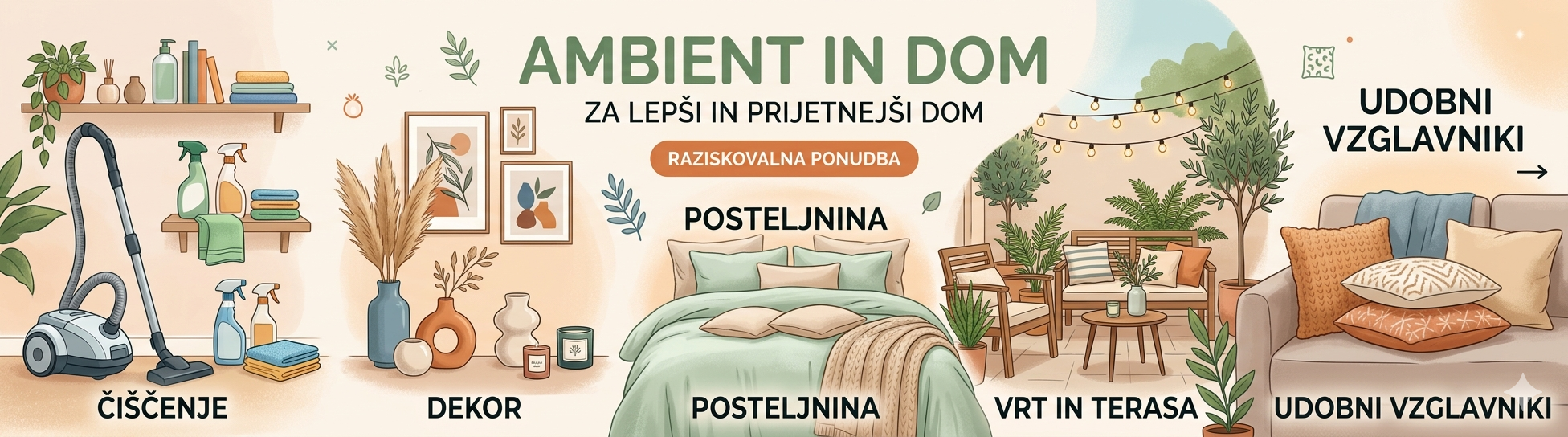 V kategoriji Ambient in dom vas čakajo izbrani izdelki za vsak kotiček vašega doma. Odkrijte učinkovite pripomočke za čiščenje, čudovite dodatke za dekor, kakovostno posteljnino, praktične rešitveza vrt in teraso ter udobne vzglavnike za boljši spanec. Naša ponudba združuje funkcionalnost, estetiko in udobje, zato boste z lahkoto našli izdelke, ki polepšajo vsakdan in izboljšajo bivanje. Naj bo vaš dom še bolj urejen, prijeten in navdihujoč z izdelki iz kategorije Ambient in dom.