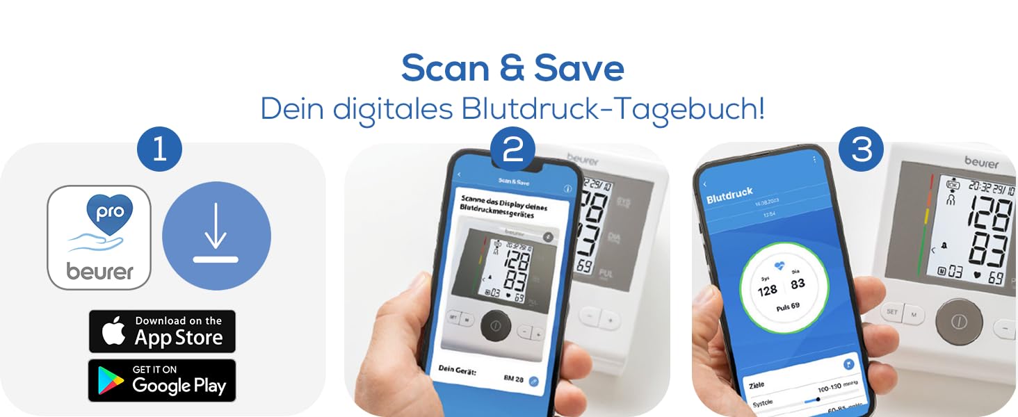 - Skeniraj in shrani: Digitalno dokumentirajte vrednosti krvnega tlaka v aplikaciji »beurer HealthManager Pro«;