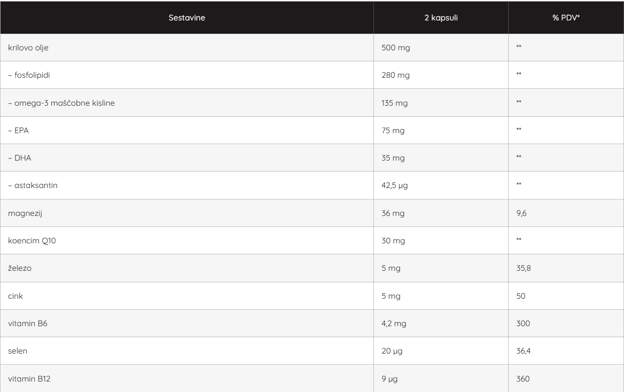 Sestavine: llipidni izvlecek morskih rakcev antarktičnega krila (Euphausia superba); magnezijev bisglicinat; sončnicno olje; emulgator: sojin lecitin; koencim Q10, železov bisglicinat; s selenom obogaten kvas; vitamin B12 (cianokobalamin); stabilizator: silicijev dioksid; cinkov oksid; vitamin B6 (piridoksin hidroklorid).